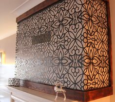 A perforated and latticed screen, usually with an ornamental pattern.